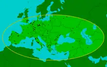 P. antiquus is known from abundant finds across Europe, ranging as north as Great Britain and as far east as European Russia during interglacial periods. Fossils are also known from Israel, Iran and probably Turkey in West Asia, and also possibly from Kazakhstan and Tajikistan. During glacial periods P. antiquus permanently resided in the Mediterranean region.[16][17] It is primarily associated with temperate and Mediterranean forest and woodland habitats, as opposed to the colder open steppe environments inhabited by contemporary mammoths.[18] Many of the remains attributed to the species from Western Asia are primarily done so for geographical reasons, and it has been suggested that some of these specimens may have closer affinities with P. recki.[19]