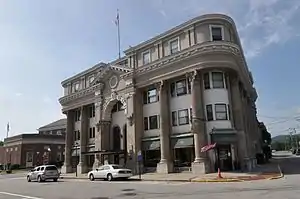 The Strathglass Building stands on a slightly non-rectangular lot bounded on three sides by Congress, Lowell, and Hartford Streets. It is now a four-story brick structure, with the bays of the first three floors separated by engaged limestone fluted columns. The main entrance is set under a three-story arch supported by square stone piers, and topped by a triangular pediment at the third floor. When originally built, the building only had three stories, and had a concrete balustrade with urns at the visible roofline.[4][5] this was removed in 1931, when the building was rebuilt after a devastating fire.[6] The interior was gutted, and all that survived intact was the heavy masonry structure. The rebuilding (as the Hotel Harris) was supervised by Lewiston architects Coombs & Harriman.[7] These additions, including the new fourth floor and flamboyant lobby, were Italian Renaissance Revival in style, though later alterations have removed most external detail. The lobby remains.