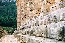 In classical Greek architecture, a stylobate (Greek: στυλοβάτης) is the top step of the crepidoma, the stepped platform upon which colonnades of temple columns are placed (it is the floor of the temple).[1] The platform was built on a leveling course that flattened out the ground immediately beneath the temple.