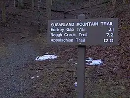 The Sugarland Mountain Trail is an American hiking trail, in the Great Smoky Mountains National Park of Sevier County, Tennessee. The trail traverses Sugarland Mountain, a massive ridge running perpendicular to the main crest of the Smokies and effectively dividing the park's north-central section from its northwestern section. Sugarland Mountain is flanked by the deep upper valleys of two of the park's major watersheds— the West Fork of the Little Pigeon River (to the east) and Little River (to the west). The trail passes through several forest types, including deciduous forest at lower elevations, heaths ("hells") along the mountain's backbone formations, and a stand of Southern Appalachian spruce-fir forest in the upper elevations. Occasional breaks in the foliage allow for views of Mount Le Conte and Sevier County to the east and Blanket Mountain and the ridges above Elkmont to the west.