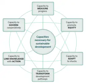 Six interdependent capacities are deemed to be necessary for the successful pursuit of sustainable development.[1] These are the capacities to measure progress towards sustainable development; promote equity within and between generations; adapt to shocks and surprises; transform the system onto more sustainable development pathways; link knowledge with action for sustainability; and to devise governance arrangements that allow people to work together.