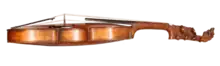 Double-decker or Dubbelplansfiol is a recent and colloquial name of the dominant variant of preserved Swedish violins with sympathetic strings, what they were called when they originated in the 18th century is not known. The Swedish collector of musical instruments Daniel Fryklund writes in 1921 that "In Sweden, the author has found several violini d'amore of a peculiar type with 4 strings and 8 resonance strings, of which the later are attached to small pegs, which are placed behind the larger screws for the playing strings in a pegbox which is extended backwards and such an arrangement of the pegs is not observed by the author on any other violin".[1] Thus, Fryklund suggests it is a specific instrument type typical for Sweden but since he only has observed five instruments he does not conclude it and calls it with the more unspecific name violino d'amore. Today more specimens have been found and out of 27 preserved Swedish violins with sympathetic strings in total, 23 are Double-deckers.[2] Also three of the four preserved instruments that are not Double-deckers are built during the 20th century, while the vast majority of the Double-deckers with a known origin are built during the 18th century which indicates that the Double-deckers are both earlier and dominant[2]