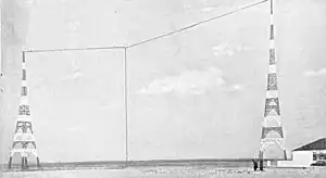 An amateur radio cage ‘T’-antenna 60 ft high by 90 ft long built in 1922, owned by the Historic Radio Engineers Club, Riverhead, New York. The conductor is made of a 'cage' of 6 wires held apart by wooden spreaders. This antenna achieved transatlantic contacts on 1.5 MHz, at a power of 440 W.