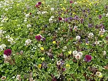 A wide variety of plant species is used, with a minimum of twelve different species and no upper limit, since environmentally unsuitable species will soon die out.[10] When more species are used there is greater scope for aesthetic choices, extending floral period and resource opportunities for pollinating insects and less chance of any one species becoming dominant in the lawn.