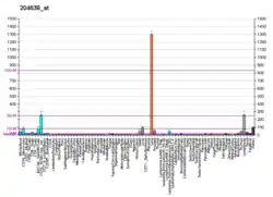 Under normal circumstances, TRAP is highly expressed by osteoclasts, activated macrophages, neurons, and by the porcine endometrium during pregnancy.[7][8] In newborn rats, TRAP is also detectable in the spleen, thymus, liver, kidneys, skin, lung, and heart at low levels. TRAP expression is increased in certain pathological conditions. These include leukaemic reticuloendotheliosis (hairy cell leukaemia), Gaucher's disease, HIV-induced encephalopathy, osteoclastoma and osteoporosis, and metabolic bone diseases.