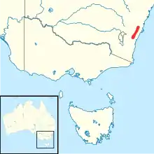 This plant may be seen between Fitzroy Falls in the north, and Monga National Park to the south. Its habitat is on the margins of temperate rainforest or in wet eucalypt forest, where it may be found along creeks or on mountain slopes, at an altitude of 540 to 760 m (1,770 to 2,490 ft).[3] It grows on sandy soils of alluvial origin.[12] It is often associated with such trees as brown barrel (Eucalyptus fastigata), silvertop ash (E. sieberi), broad-leaved peppermint (E. dives), Sydney peppermint (E. piperita), and the understorey plants pinkwood (Eucryphia moorei), soft tree fern (Dicksonia antarctica), coral fern (Gleichenia), mountain devil (Lambertia formosa) and hairpin banksia (Banksia spinulosa). The annual rainfall where it grows is 1,000–1,100 mm (39–43 in).[12]