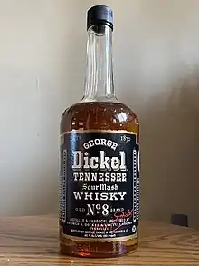 George Dickel began production of a rye whiskey in 2012 that also cannot be labeled a Tennessee whiskey because it is produced from a rye-based mash and is not distilled in Tennessee. Most of the stages of its production are conducted under contract in Indiana, and the whiskey is then trucked to the Diageo bottling plant in Plainfield, Illinois, for filtering with charcoal made at the Dickel distillery and then bottling.[28] In early 2014, the brand introduced a white corn whiskey using an unaged version of its standard mashbill, which consists of more than 80% corn, allowing for its sale as "corn whiskey".[29] The bottle makes no reference to Tennessee whiskey. Dickel would go on to release a Bourbon whiskey.