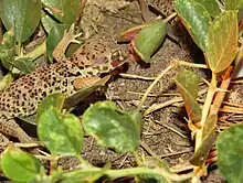 The gecko is known to employ various defensive and escape behaviors across different stages of its life to evade predation. It is known to autotomize its tail in defence, and individuals with regenerated tails can be observed. When threatened, adults are reported to take an arched posture while waving their tails from side to side, the tail scales making a hissing sound (presumably to intimidate predators).[12] Juveniles may stiffen their bodies and curl their tails forward in a scorpion-like pose when provoked, which is believed to be Batesian mimicry of Mesobuthus scorpions. In addition, the juveniles are similar in size, coloration and escape behavior to these scorpions, making it difficult to distinguish between the two during their moonlit foraging hours, further supporting this theory. When fleeing, the adult lizard tends to run in a zigzag pattern and for longer distances than the juvenile, which generally runs a short distance in a straight line similar to the Mesobuthus scorpions. By mimicking the venomous scorpion, the comparatively harmless juvenile gecko may be able to deter predators from attacking it. Individuals of all ages may retreat to their burrows or hide under foliage when pursued.[9]