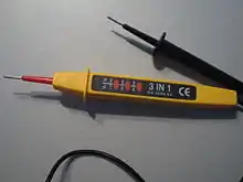 The test light is an electric lamp connected with one or two insulated wire leads.[1] Often, it takes the form of a screwdriver with the lamp connected between the tip of the screwdriver and a single lead that projects out the back of the screwdriver. By connecting the flying lead to an earth (ground) reference and touching the screwdriver tip to various points in the circuit, the presence or absence of voltage at each point can be determined, allowing simple faults to be detected and traced to their root cause. For higher voltages, a statiscope consisting of a neon glow tube mounted on a long insulating handle can be used to detect AC voltages of 2000 volts or more.