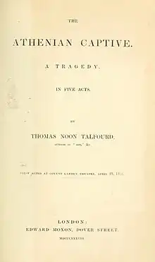 The Athenian Captive is an 1838 tragedy by the British writer Thomas Talfourd. It was originally intended to be performed at Covent Garden in London but after rehearsals the illness of one of the actresses forced delays. This led him to take it instead to the Theatre Royal, Haymarket where it premiered on 4 August 1838.[1] The Haymarket cast was led by William Macready as Thoas and Mary Warner and Isme, and the production enjoyed success.[2] Other cast members included James Prescott Warde as Creon, Henry Howe as Lycus and Helena Faucit as Creusa. Talfourd dedicated the play to Lord Denman, the Lord Chief Justice.