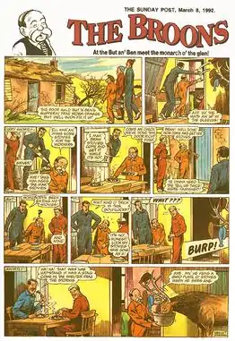 The Broons (English: The Browns) is a comic strip in Scots published in the weekly Scottish newspaper The Sunday Post. It features a Brown family, which lives in a tenement flat at 10 Glebe Street (since the late 1990s) in the fictional Scottish town of Auchentogle or Auchenshoogle.