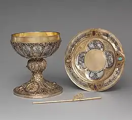 A further major early source of objects was the art dealer Joseph Brummer (1883–1947), long a friend of a curator at the Cloisters, James Rorimer. Rorimer had long recognized the importance of Brummer's collection, and purchased large quantities of objects in the months after Brummer's sudden death in 1947. According to Christine E. Brennan of the Metropolitan, Rorimer realized that the collection offered works that could rival the Morgan Collection in the Metropolitan's Main Building, and that "the decision to form a treasury at The Cloisters was reached... because it had been the only opportunity since the late 1920s to enrich the collection with so many liturgical and secular objects of such high quality."[24] These pieces, including works in gold, silver, and ivory, are today held in the Treasury room of the Cloisters.[24]