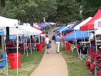 Described as "the Holy Grail of tailgating sites" by Sporting News,[4] The Grove comes to life for Ole Miss Rebels football home games with typically over 100,000 fans.[5] Fans arrive often around noon the day before the game (campus rule is no one allowed to "stake their claim" before 7:30 pm,[6] which is strictly enforced by campus police) to grab their spot in The Grove. This usually serene area of campus becomes a sea of red, white and blue tents. However, most of the tents are set up by professional tailgate vendors and not the students or families themselves.[7] Ole Miss students generally dress in their Sunday best: Men wear slacks, button-up shirts, bow ties, Sperry Top Siders, and coats while women wear cocktail dresses or brightly colored sundresses and high heel shoes. Some older fans also dress in this style.[1]