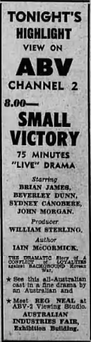 Small Victory is a 1958 television play broadcast by the Australian Broadcasting Corporation. It was set during the Korean War.[2] It was directed by William Sterling and was shot in Melbourne where it aired 26 March 1958.[3]
