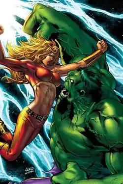 A future version of Thundra took cell scrapings from the Hulk which were used by scientists in the future to impregnate her.[25] This Thundra later gives birth to a green skinned daughter who is the child of herself and the Hulk. This girl, Lyra, is later nicknamed "She-Hulk". She later returns to the future to insert Lyra's birth.[26]