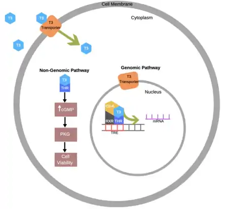 Thyroid hormone is transported into the cell through a transporter. Once inside of the cell, the hormone can have genomic or non-genomic effects.[3] The genomic signaling pathway directly influences gene transcription and translation, while the non-genomic pathway involves more rapid, cellular changes, some of which also regulate gene expression through more indirect signaling.[8]