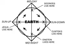 Ray's personal model of reality, called "Time Cube", states that all of modern physics and education is wrong,[4] and argues that, among many other things, Greenwich Time is a global conspiracy. He uses various graphs (along with pictures of himself) that purport to show how each day is really four separate days—SUN-UP, MID-DAY, SUN-DOWN, and MID-NIGHT (formerly morning, early afternoon, late afternoon, and evening)—occurring simultaneously.[3][5]