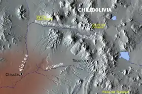Toconce is a small Chilean village located on the south rim of the Toconce River Canyon at 3,350 m above sea level.[1] To the north, the landscape is dominated by the volcanoes Cerro Paniri, Cerro del León and Toconce.