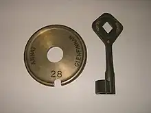 The Ternkey System ("Token Exchange using Random Numbers" system) is a hybrid between conventional token working and internet technology. Conventional "trapped key" pin tumbler locks (held in fixed position by solenoids) are mounted in key-release units set up at each end of controlled single line. The number of locks in each unit is determined by the expected traffic frequency; optionally at times short sections may be combined to reduce the number of stops . The units are connected to a central control computer by internet. The central computer conducts a "census" of keys before releasing a solenoid and freeing a key for the required section of track—an engraved tag identifying the respective section of track is securely attached to the relevant key. The system is in use on the Isle of Man Railway between Castletown and Port Erin.[11][12]