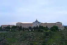 As the result of a siege, the Alcázar was reduced to a ruin during the Spanish Civil War. After the war the Infantry Academy was provisionally installed in Zaragoza, at the building of the Military General Academy, and in Guadalajara, San Diego de Alcalá Foundation headquarters.[3] During 1948 - 1949, the academy returned to Toledo, to a new building, which was the work of the military engineers Lieutenant Colonel Manuel Carrasco Cadenas, Lieutenant Colonel Arturo Ureña Escario, and Lieutenant Colonel Julio Hernández García. The building, constructed in Neo-Renaissance and Neo-Herrerian style, harmonizes well with the Alcázar, located on the opposite side of the River Tagus.[4]
