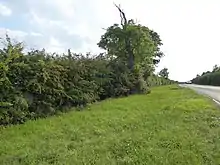 These grass road verges on Jurassic limestone have several regionally uncommon plants. They are dominated by tor-grass and upright brome, and there are calcareous grassland herbs such as spiny restharrow and stemless thistle.[3]