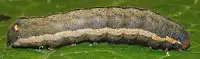 T. atriplicis L. (43 g). Forewing greyish purple irrorated with fuscous; the basal area and the shade preceding submarginal line, especially in the lower half, and the upper stigmata bright pale green; median area below subcostal vein deep dark green; a large white, generally pinkish-tinged blotch with bifid extremity runs along vein 2 to outer line; submarginal line greenish white, angled sharply inwards on submedian fold and bluntly beyond the cell, accompanied by dark and light green clouds; hindwing fuscous grey, the outer half dark fuscous, with traces of dark cellspot and outer line; — ab. similis Stgr., recorded from Ussuri. and also Central Germany, has the green tints altered into olive, and the pale blotch yellow; ab. diffusa Spul. has all the markings faint and washed out; (this is usually the case with bred examples); the Japanese form — ab. gnoma Btlr. (43 g) is larger, deeper purple, the green shadings less developed, the white blotch larger and more conspicuous. — Larva purplish brown, sometimes with a green tinge; dorsal and subdorsal lines blackish, with faint oblique lateral stripes; spiracular lines pinkish white, darker above.[1] The wingspan is 38–42 mm. The length of the forewings is 20–22 mm.