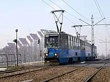 The fleet of 70 Konstal 105 was built between 1979 and 1992.[7] It is 13.5-metre (44 ft)-long and can form longer trains (theoretically up to five cars, in practice the two-car and three-car trains are operated).[8] Due to the unreliability and the poor technical design, they are slowly replaced by second-hand trams from Germany.