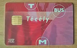 Introduced on 1 July 2002,[7] the Técély card (Carte Técély) is the contactless smartcard of the TCL network. The card itself costs €5 and is usable during five years, it can be obtained in the five TCL agencies or by mail order.[8]