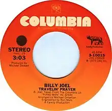 "Travelin' Prayer" is a song written and performed by singer Billy Joel, and released as the third US single from his 1973 album Piano Man. The song is "urgent" and "banjo-fueled".[2] It reached number No. 77 on the Billboard Hot 100 and No. 34 on the Adult Contemporary chart in 1974. It was a slightly bigger hit in Canada, where it reached No. 61.