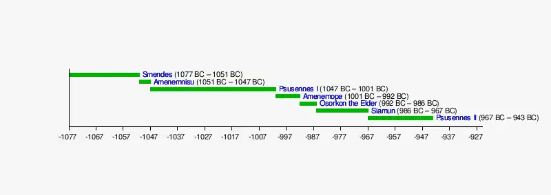 The Twenty-first Dynasty of Egypt (notated Dynasty XXI, alternatively 21st Dynasty or Dynasty 21) is usually classified as the first Dynasty of the Ancient Egyptian Third Intermediate Period, lasting from 1077 BC to 943 BC.