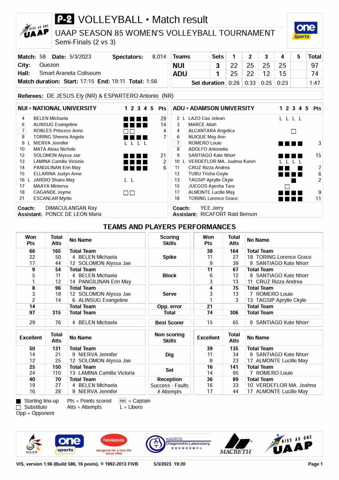 - ↑ "UAAP 85 GVB: Abegail Pono, NUNS show resolve vs Adamson, take back-to-back". Tiebreaker Times. March 20, 2023. Retrieved March 20, 2023.
