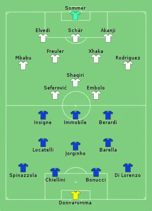 - 1 2 3 "Tactical Line-ups – Italy v Switzerland" (PDF). UEFA.com. Union of European Football Associations. 16 June 2021. Retrieved 16 June 2021.