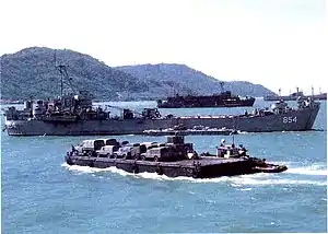 On the outbreak of the Korean War, the United States responded by sending forces to aid South Korea. To assist in the transportation of troops and cargo, LST-854 was re-commissioned on 20 November 1950; then, after training, she departed San Diego on 17 March 1951. Three months later she commenced operations in the War Zone, and from June to December operated between Japan and Korea. Her duties in Korea were transporting prisoners-of-war from Pusan to Koje Do, furnishing logistics support for troops at Koje Do, and rotating cargo and troops among Korean ports. During early January 1952 LST-854 participated in the landing of the 40th Division at Inchon and provided refugees lifts along the Korean coast. Departing Yokosuka on 25 February, the landing ship arrived at San Diego on 16 March. After overhaul and training along the West Coast, she was back in Japan on 26 November. For the remaining months of the conflict, LST-854 shuttled troops and cargo in support of United Nations Command forces engaged in fierce combat on the Asian mainland. Following the truce which ended hostilities, the veteran landing ship transported pro- and anti-Communist prisoners to await repatriation.