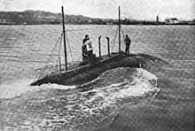 Shortly after the United States entered World War I, A-5 sank while moored at the Cavite Navy Yard on 15 April 1917; her sinking was attributed to a slow leak in a main ballast tank. She was raised on 19 April and, following reconditioning, returned to active service. Like her sister-ships, she patrolled the waters off the entrance to Manila Bay during the course of the war with the Central Powers.