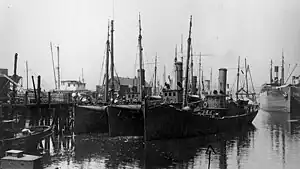 Fishing trawlers Foam (left), Ripple (center), and Spray (right), probably prior to their U.S. Navy service as naval trawlers and minesweepers USS Foam (ID-2496), USS Ripple (ID-2439), and USS Spray (ID-2491).