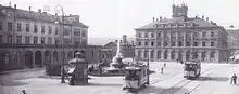 The Ulm tramway opened two lines to the Ulm station forecourt on 15 May 1897. While one tram line linked the stations of Ulm and Neu-Ulm, the other ran on the ring around the city centre. Construction of the Zingler Bridge that crosses the tracks south of the station gave the residents of the suburbs lying to the west of the station a connection to the Ulm trams that they had long demanded. The tram crossed the bridge and continued to Söflingen from 18 October 1906. On 14 May 1947, an Ulm trolleybus service was put into operation; its two lines had a stop at Ulm station. It replaced tramline 2 to Neu-Ulm, which had been closed on the 24 December 1944 due to the effects of the war. On 23 October 1963, the trolleybus operation was abandoned and replaced by diesel buses. Starting from 22 May 1967, Ulm tramline 1 used the Ehinger-Tor underpass, completed in 1966, from Donaustadion to Söflingen instead of the Zingler bridge. On 21 March 2009, line 1 was extended from Donauhalle to Böfingen.[47] On 12 September 2018 tramline 2 was opened.[48]