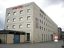 In the lobby of the building there is a large two-piece LCD departures board and the stairs to the platform underpass. To the south of the entrance hall the Markt im Bahnhof (market in the station) was opened on 1 September 1992 with a variety of shops.[32] The main entrance to the lobby is almost entirely glazed and the area outside the main entrance in the station forecourt was covered by a glass roof extending into the road on 4 September 1993.[33] Under the glass roof are the stairs to the underpass that connects the station with the tram and bus station and the city centre. Directly adjoining to the entrance to the north wing there are more shops, the travel centre and a connection to the former freight shed. The InterCity Hotel with 135 rooms opened on 1 September 1992 as a replacement for the old Deutsche Bundesbahn Hotel, which was demolished in April 1991 and stood on the same site.[32]