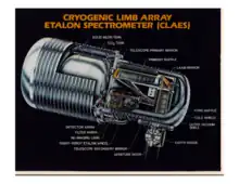 In order to differentiate the relatively weak signature of trace gases from the background radiation in the atmosphere, CLAES had to have high resolution and sensitivity. To achieve this, the instrument combined a telescope with an infrared spectrometer. The whole instrument was cryogenically cooled to keep heat from the instrument from interfering with the readings. The cryogenics system consisted of an inner tank of solid neon at −257 °C (−430 °F) and an outer tank of solid carbon dioxide at −150 °C (−238 °F). As the neon and carbon dioxide evaporated, they kept the instrument cool for a planned 19 months.[6] The final cryogens evaporated from the instrument on May 5, 1993, and the instrument warmed up, ending its useful life.