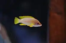 Variabilichromis moorii has no common name and is a species of freshwater cichlid endemic to Lake Tanganyika in eastern Africa. It is a small ovate bodied fish named for an early collector of fish from the lake, John Edmund Sharrock Moore (1870-1947) who was a cytologist, zoologist and led an expedition to Lake Tanganyika and who discovered this species.[2] Juveniles are usually yellow, and adults are dark brown to black in color.[3] It reaches a total length (TL) of 10.3 centimetres (4.1 in). Currently it is the only member of its genus. V. moorii feeds on algae, zooplankton, and benthic invertebrates. It is also found in the aquarium trade.[4]