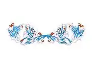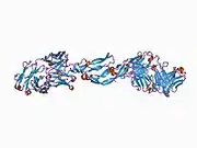 The binding of VEGF-A to VEGFR2 causes two VEGFR2 molecules to combine to form a dimer. Following this dimerization, through the action of the receptor itself, a phosphate group is added to certain tyrosines within the molecule in a process called auto-phosphorylation.[18] The autophosphorylation of these amino acids allows for signalling molecules within to the cell to bind to the receptor and become activated. These signalling molecules include VEGF-receptor activated protein (VRAP), PLC- γ and Nck.[19][20][21]