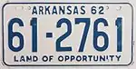 1962 | Embossed blue serial on white plate with border line; "ARKANSAS 62" centered at top | "LAND OF OPPORTUNITY" at bottom | 1-12345 10-12345 |