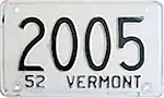 1952 | Embossed dark green serial on white plate; "52 VERMONT" centered at bottom | none | 12345 | 1 to 99999 | |