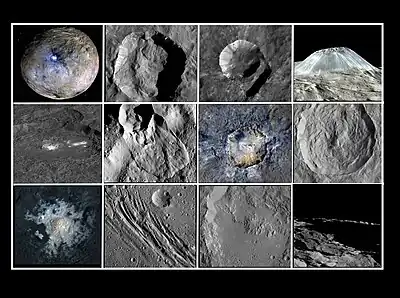 As of 2020, the IAU has approved names for 151 geological features on Ceres: craters, montes, catenae, rupēs, plana, tholi, planitiae, fossae and sulci.[2][3] In July 2018, NASA released a comparison of physical features found on Ceres with similar ones present on Earth.[4]