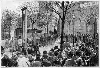 Victor Prévost's trial was held before the cour d'assises in Seine, chaired by Mr. Hardouin and two assessors, on December 7, 1879. At quarter past eleven, the accused entered, accompanied by eight guards. The defence was provided by Mr. Bouchot, while the Attorney General was Mr. Lefebvre de Biefville. While reading through the indictment, which included details and the way in which the two murders were committed, Prévost stood upright and remained calm, but his discouragement could be felt. He then answered questions from the judge, who made him confirm the facts and clarify details.[2] It was then when the witnesses were called, confirming the depositions made during the instruction. Then following the indictment, during which Prévost seemed to accuse the police of a cover-up, and pleaded to his lawyer.