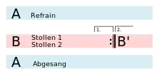 Within this overall structure, the number of lines and the rhyme scheme is variable. The refrain and Abgesang may be of three, four or five lines each, with rhyme schemes such as ABA, ABAB, AAAB, ABBA, or AABBA.[2] The structure often involves an alternation of longer with shorter lines. Typically, all three stanzas share the same set of rhymes, which means that the entire poem may be built on just two rhymes, if the Stollen sections also share their rhymes with the refrain.