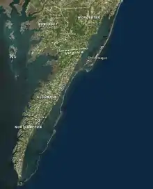 The Virginia Barrier Islands are a continuous chain of long, narrow, low-lying, sand and scrub barrier islands separated from one another by narrow inlets and from the mainland by a series of shallow marshy tidal bays along the entire coast of the Virginia end of the Delmarva Peninsula.[1][2][3] Several of these islands were once significantly larger, covered with pine forests, and inhabited. After the completion of the New York, Philadelphia and Norfolk Railroad in the late 19th Century, at least five lavish hunting and fishing clubs were established on Virginia's barrier islands and they became a playground for wealthy sportsmen from Northeastern cities who would arrive by train. US President Grover Cleveland visited Hog Island to hunt waterfowl and go fishing in the early 1890s.