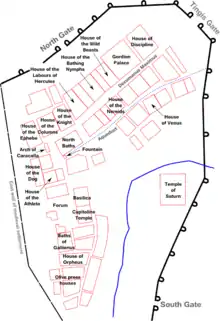 There were five other temples in the city, of which the most notable is the so-called "Temple of Saturn" that stood on the eastern side of Volubilis.[49] It appears to have been built on top of, or converted from, an earlier Punic temple, which may have been dedicated to Baal.[58] It is a sanctuary with a surrounding wall and a three-sided portico. In its interior was a small temple with a cella built on a shallow podium.[49] The temple's traditional identification with Saturn is purely hypothetical and has not generally been accepted.[59]