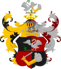 Johann Fabricius served Maximilian II against the Turks and was given a coat of arms by the imperial Letters Patent of 2 November 1564.[1] His son Martin was ennobled on 10 December 1577. They were granted a swan coat-of-arms where the swan is in an attack position on the shield; this is repeated in miniature "above the crown".[2]