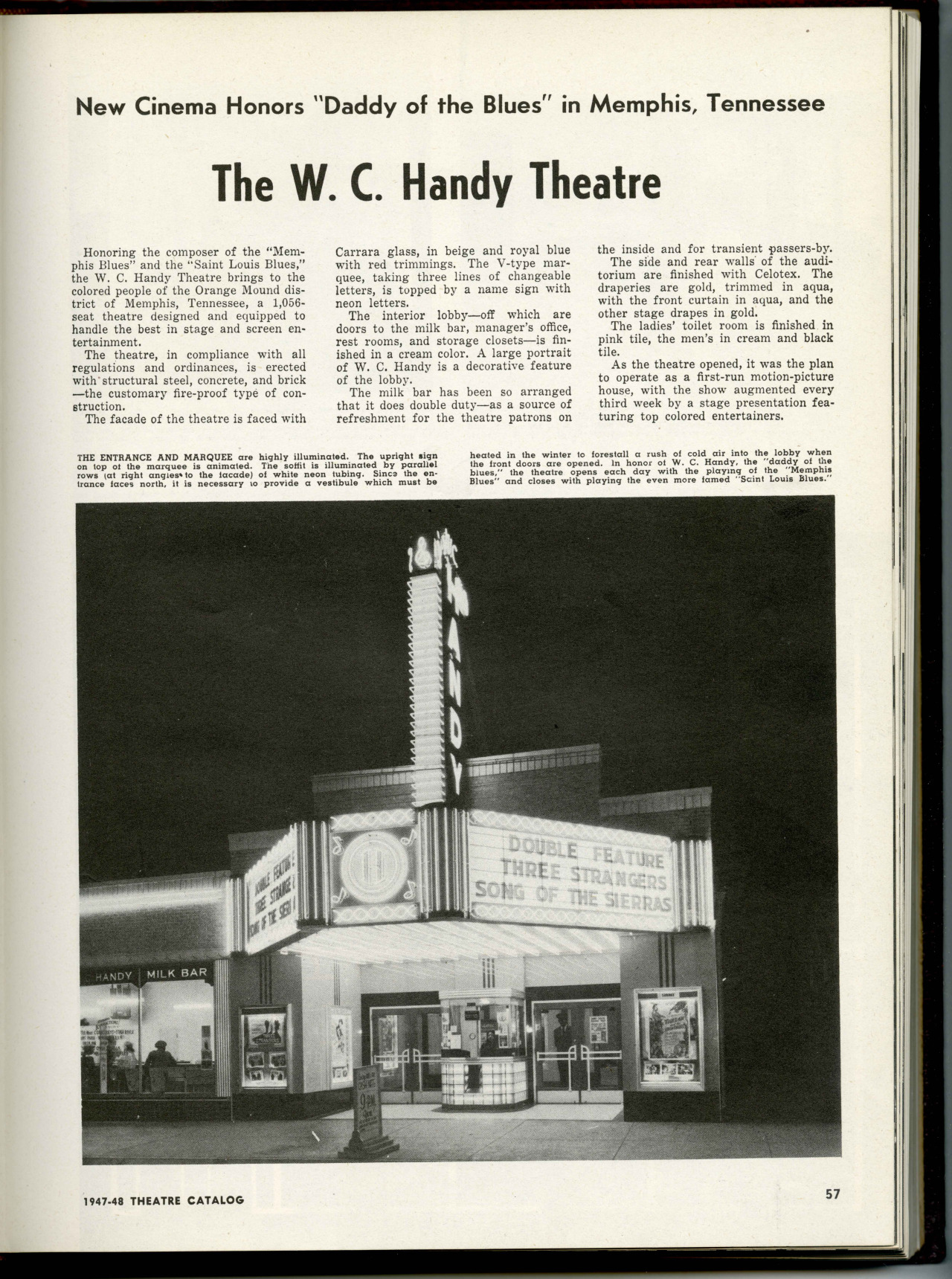 5. "New Cinema Honors "Daddy of the Blues" in Memphis, Tennessee: The W. C. Handy Theatre". 1947-48 Theatre Catalog: 57.