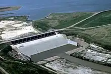 Part of the Pick–Sloan Missouri Basin Program authorized by the Flood Control Act of 1944, Glen Elder Dam was one of six units in the Smoky Hill River basin specified as necessary for flood control and irrigation. The U.S. Bureau of Reclamation began purchasing rights-of-way in June 1963 and started constructing the dam and Waconda Lake in November 1964.[6] Despite efforts to preserve Waconda Spring as a national monument, the health spa was torn down, and, in 1968, the spring itself was sealed.[7] Construction finished in January 1969, and the spring was submerged beneath the new reservoir.[6]